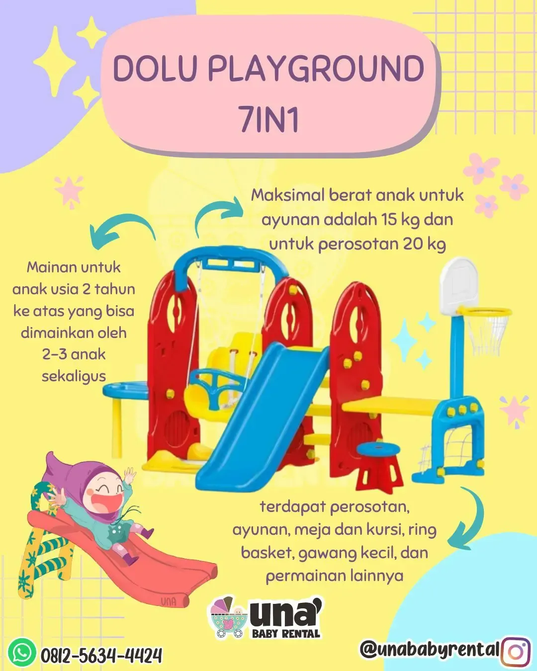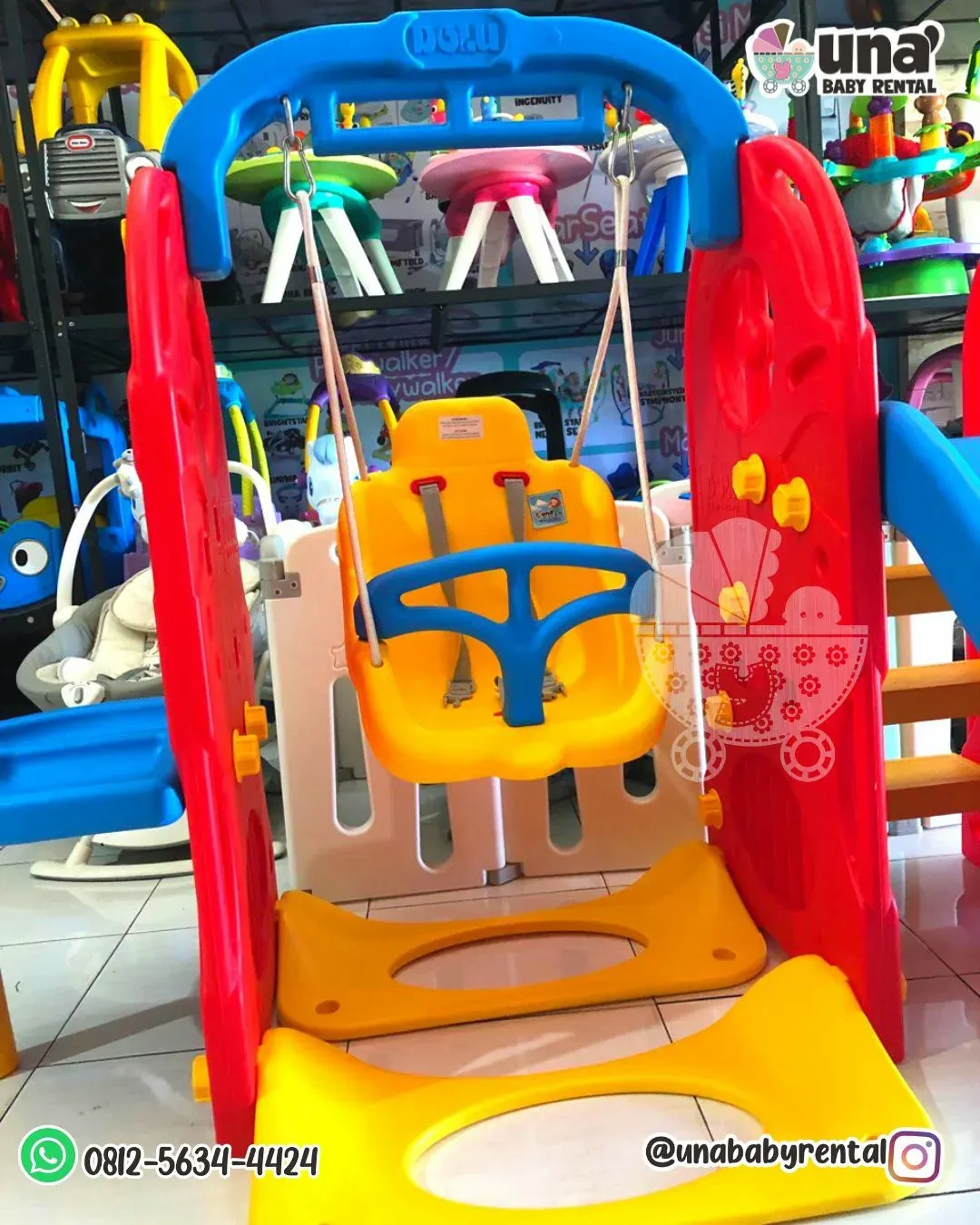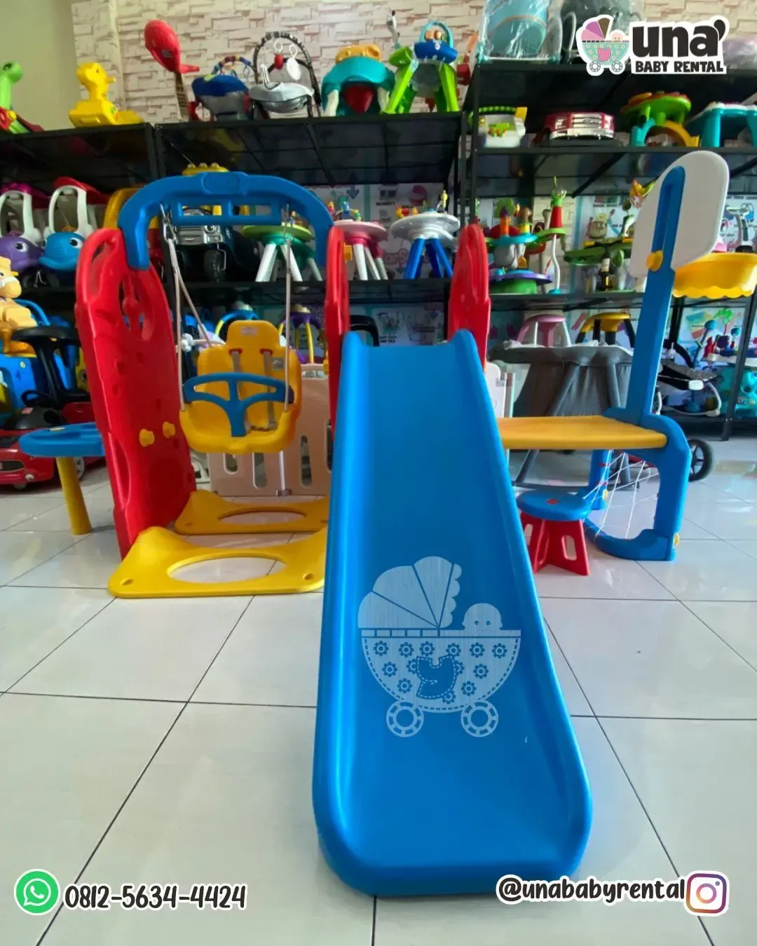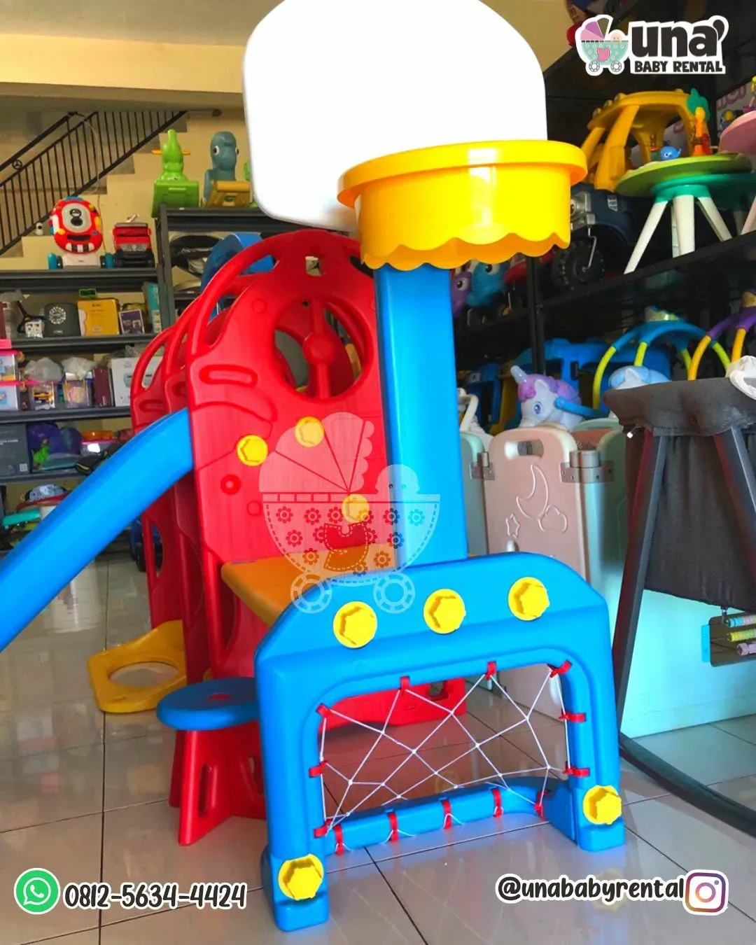 Mainan playground untuk anak usia 2 tahun ke atas yang terdiri dari perosotan, ayunan, meja dan kursi, ring basket, gawang kecil, dan permainan lainnya.
